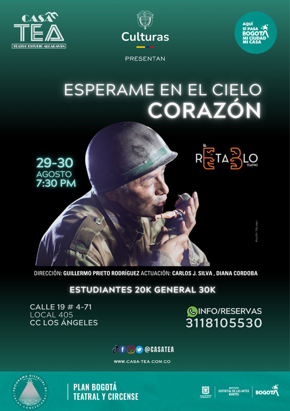 “Espérame en el cielo corazón” Es un homenaje que le hace el teatro El Retablo a una persona que con coraje y valentía se adentró en el conflicto armado, y confrontó con investigación, documentación y verdad a todo el pueblo colombiano sin importar su ideología política. Las funciones de esta obra tan necesaria para la memoria serán el 29 y 30 de agosto en la sala CASA TEA a las 7:30pm.