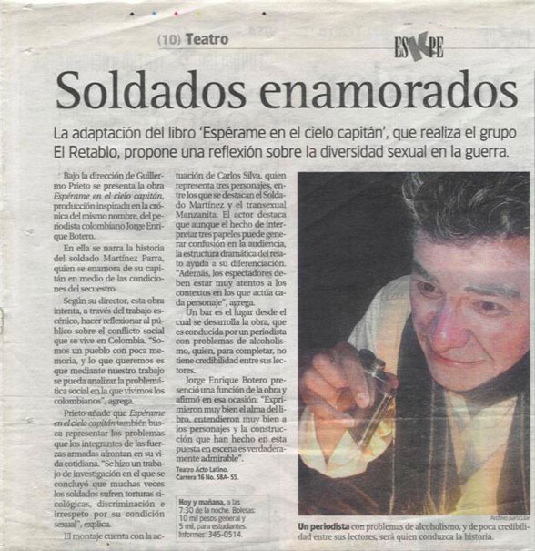 Montaje inspirado en la crónica periodística del libro «Espérame en el cielo capitán» del periodista colombiano Jorge Enrique Botero; en la cual se dan cita el periodista Julio Fuentes, señalado por inventar reportajes, el soldado Martínez Parra Johny Gerardo, la misma manzanita, muchacho caleño que llega a Bogotá después de prestar el servicio militar y de vivir los horrores del secuestro, la guerra y la violencia. Esta versión permite reflexionar sobre el conflicto armado colombiano, derechos humanos, niños y niñas en la guerra, diversidad sexual, objeción de conciencia, acuerdo humanitario, desplazamiento forzado, entre otras problemáticas vigentes en la agenda pública del país. La obra está Dirigida a jóvenes y adultos.