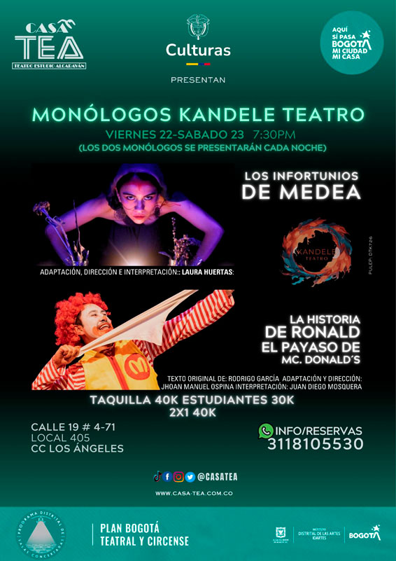 La creación de un monólogo le permite a un actor dominar la escena por sí solo y explorar una variedad de habilidades nuevas. “Kandele Teatro” presentará dos unipersonales este 22 y 23 de Agosto a las 7:00pm en CASA TEA: “La Historia de Ronald el payaso de Mc.Donals” interpretado por Juan Diego Mosquera y “Los infortunios de Medea” interpretado por Laura Huertas. Los dos se presentarán cada noche.