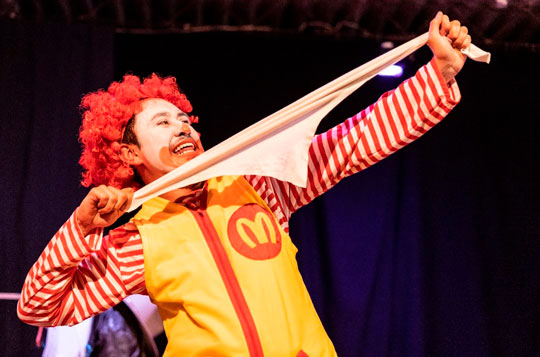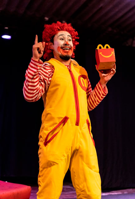 “La Historia de Ronald el payaso de Mc.Donals” es un texto original de Rodrigo García, un dramaturgo argentino nacionalizado también español y está dirigida por Jhoan Manuel Ospina, actor y director Quindiano, del que tengo el gusto de ser su amigo, su estudiante, su colega; Este montaje nace en el 2021 después de pandemia en Armenia, Quindío. Nos llega el texto, yo le propongo a Jhoan hacerlo, y el acepta de inmediato montar este monólogo. Fueron meses de trabajo intensos, y hoy en día la obra ya tiene alrededor de 30 funciones, lo he presentado en varios espacios. Es un texto universal porque es muy vigente, habla de unas problemáticas políticas, sociales, económicas y con la agitación que se vive hoy en día a nivel mundial creo que es muy pertinente seguirlo haciendo, que siga viviendo en las diferentes salas del país. Para mí hacer el monólogo es un agradecimiento muy grande con la vida, con el teatro, porque me da la oportunidad de decir un montón de cosas que sólo puedo decir interpretando este personaje, me da mucha felicidad, y siento que es necesario que todo el mundo lo vea, lo escuche, sobre todo porque nos pone a pensar cuál es nuestro papel como individuos en esta sociedad actual del consumismo y que posición tomamos en cuanto a lo político, a lo social, a lo económico y a lo cultural.